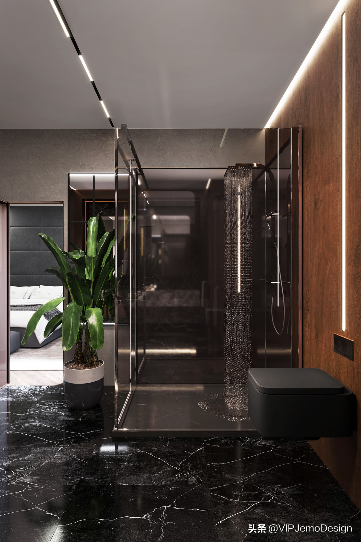 马桶附近灯光也不要过于强烈,否则会影响视线,只需要筒灯或者灯带辅助照即可,光线也比较温馨自然。