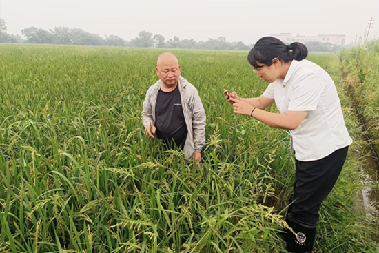 稻田里,工作人员仔细查看中稻长势,向种植大户核对面积、询问病虫害情况,同步记录数据、拍摄影像,确保验标信息真实准确。针对不熟悉参保流程的农户,他们耐心讲解保险政策,“一对一”协助填写资料。即便汗水浸透衣衫、皮肤晒得通红,大家依旧高效协作。